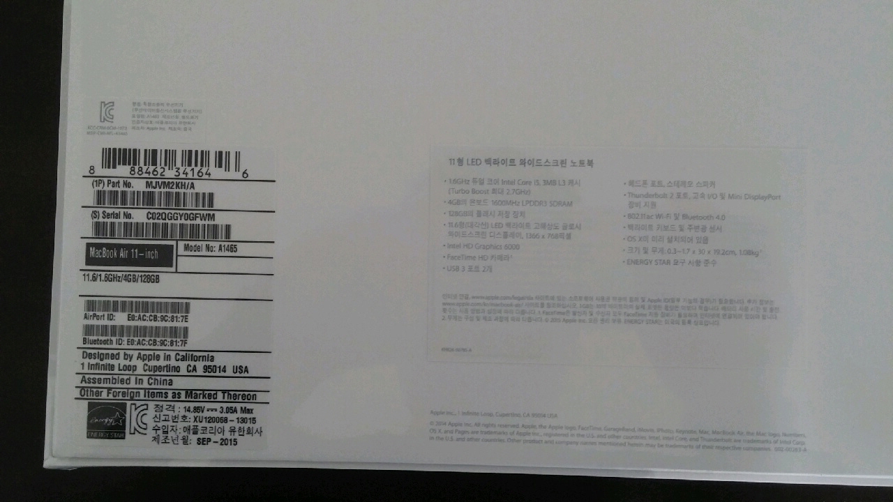 2015년 맥북에어(Macbook air) 11인치 (개봉전) 팝니다.