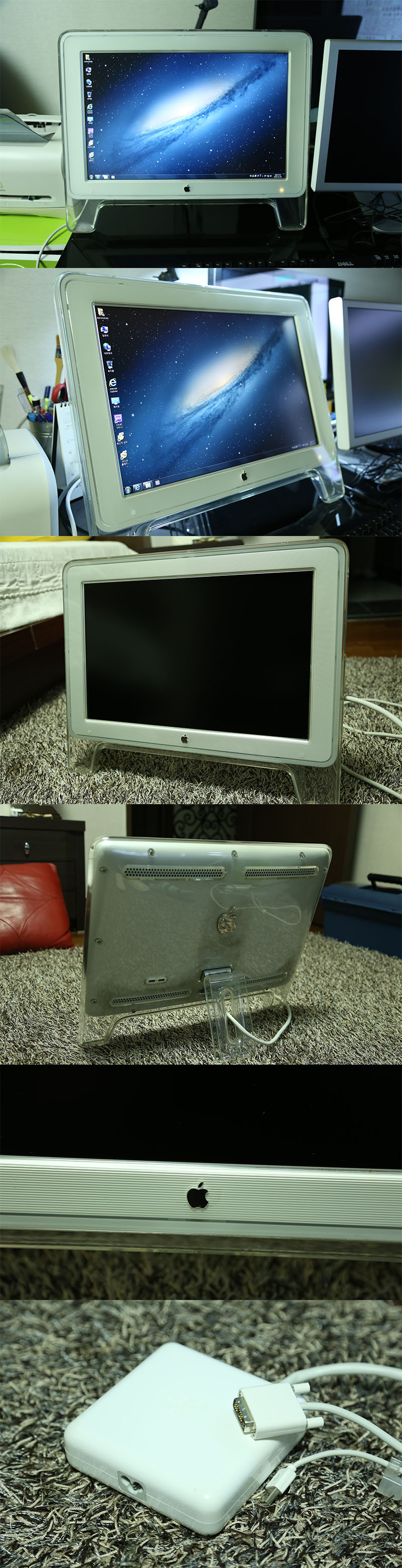 전체적인 상태는 좋구요, 후면에 약간의 그을림(?) 은 있습니다. 받침대 짱짱하구요. adc어댑터도 같이 포함입니다.  일반 DVI단자에서 사용케끔 해주는 고마운 녀석이죠^^