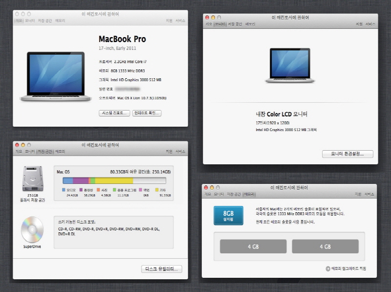 - 메모리 8GB 1333 MHz DDR3 ( 4GB * 2 )