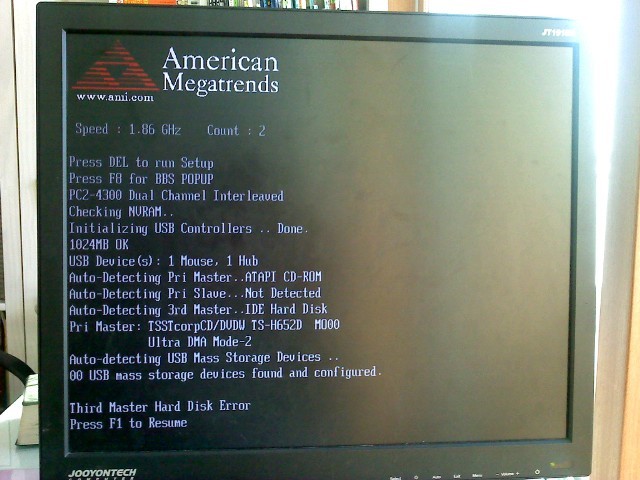 emoticon_096 일단, 본체 전원을 끄고...내장하드에 연결된 IDE케이블과 전원케이블을 빼었다 다시 연결후 켜보세요.