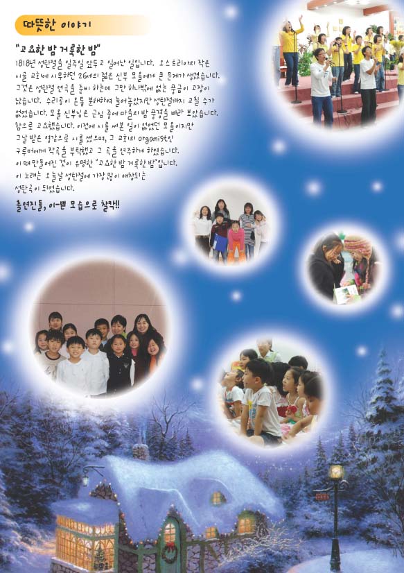 15일 올리신건데..오늘쯤(16일)엔 인쇄가 끝났겠네요^^.. 그냥 개인적으로 밑에 배경이 성탄절에 비해 좀 추워보이지 않나싶네요..한색 계열이라도 좀 따뜻한 밤(새벽)이 표현되었으면 좋았을꺼 같습니다...이쁘게 나왔나요? ^^