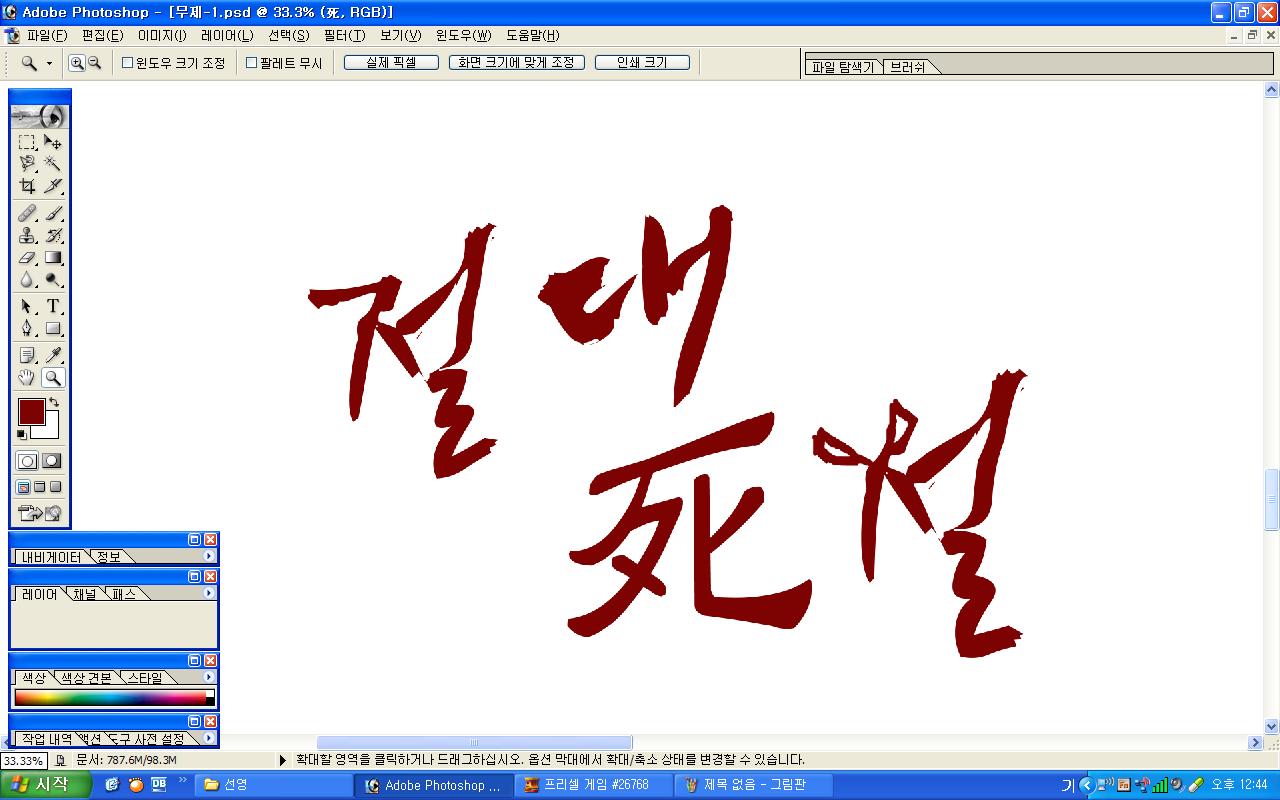 정중히 캘리 부탁드립니다. -_- 류재철 일반 0 5409 2009.11.16 11:18 실력자 분들이 많이 계셔서 이렇게 염치없게 부탁드립니다. - 절대死절 : 첨부한 파일 참고해주시면 감사하겠습니다.(약간 거친느낌? ^^;;) : '절'자의 ㅈ은 가위로...^^;; : 포스터 제작용이라 ai 파일이 필요합니다. 대학동아리 연극공연 포스터로 쓸 예정입니다. 비상업적인 공연이라 이렇게 부탁드립니다.